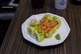 In addition to my son’s usual Nigiri(tamago, unagi, chopped scallop and Atlantic salmon), we got a couple of rolls. On the same platter, there was the Rainbow Rollconsisting of a California roll topped with Atlantic salmon, tai, mackerel, ebi and albacore tuna. For me, this has become a pretty basic roll found on many Japanese menus in town. Once again, the impressiveness of the roll didn’t lie with the visuals. Rather, it was the freshness of the ingredients and the care that was taken with its construction. Again, on point textures with the rice and fish. Something a bit different, we got the Special Spicy Salmon Roll with soy paper on the outside and finished with jalapeno. It wasn’t super spicy (which is usually the case), but the jalapeno upped the spice level. Rice was nicely chewy while the soy paper added another layer of texture.