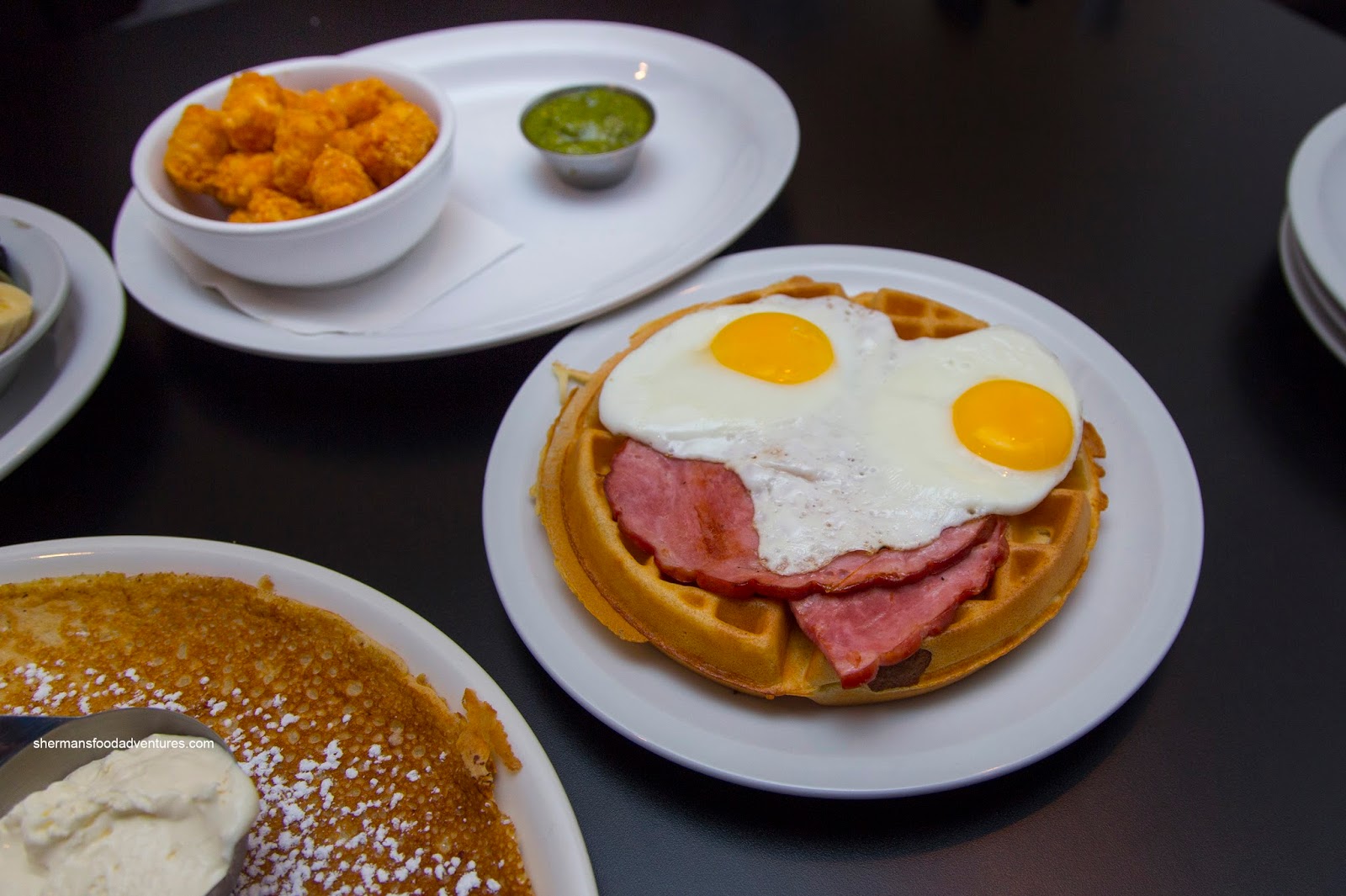 We ended up sharing 4 dishes amongst us including the 3 Cheese Omeletwith multigrain toast, fresh fruit and house fire-roasted salsa. This was a modest-sized omelet that was neatly folded and filled with just enough melted gouda, cheddar and jack cheeses. I thought the egg was still fluffy and not overdone. It was really thin, which made it rather light to eat. The fire-roasted salsa was bright with only the slightest amount of spice to go with the tang. We also decided on the Farmhouse Waffle topped with thick-cut country ham and 2 sunny-side eggs. Frankly, there wasn’t anything special about the waffle, but it was still good. I found it a touch dense while not crispy enough on the outside. We asked for sunny-side eggs and they were perfectly prepared with cooked-through whites while retaining a completely runny yolk. On the side, the side of tatar tots were on point being extra crispy. It came with a side of pesto that tasted eerily like the one found at Costco.