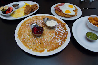 Onto their signature items, we had the Hipster Hash Pancakefeaturing a thin-Pannekoek like crepe pancake topped with a dish of hash. It consisted of hashbrowns, country ham, back bacon, turkey bacon, peppers, onions, corn and tomato topped with a sunny-side egg (extra +$1.50) Hollandaise and avocado. For a hash, it lacked carmelization and searing. Therefore, the flavours were not developed and visually, it looked more like it was tossed together. Once again, the egg was perfect while the Hollandaise was creamy and well-balanced. As for the pancake, it was similar to de Dutch but a touch thicker and spongier. We ended things off with the Four Berry Cheesecake Pancake with cream cheese whip, graham crumble and a compote of blueberries, blackberries, strawberries and raspberries. This was my favourite as the flavour was exactly as described. Overall, I felt that the BFPC has loads of potential, especially for its location. Prices are fair when compared to de Dutch and ingredients were fresh. Just a bit more consistency would put it over the top.